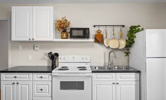 Comfortable sleeping arrangements with a king-sized bed in the bedroom and a sofa bed in the living area. Stay connected with fast and reliable Wi-Fi throughout the apartment. Whether you're here for business or leisure, our cute and cozy downtown retreat offers the perfect blend of comfort and convenience.