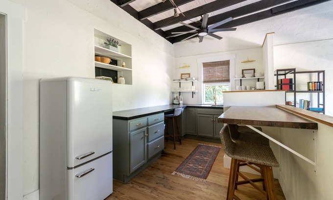 In the kitchen you will find plenty of counter space for preparing your meals, a retro style refrigerator, electric range, microwave, Keurig coffee maker, toaster, pots and pans and large 30" kitchen sink. Please note we do not have a dishwasher!