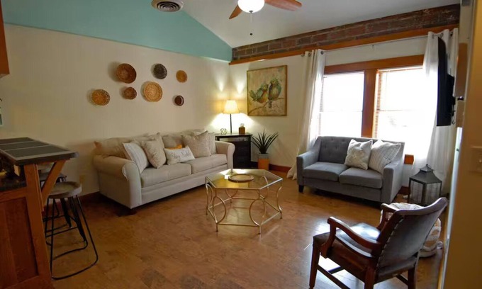 Step into this guest favorite 2-bedroom loft, located in the Historic Mitchell Bros Building in downtown Bloomington, IN. Loved for its industrial charm, this unit features exposed brick, original wood floors, and modern touches like Keurig coffee, free parking, and secure access. Walk to IU, Kirkwood, shops, and restaurants, or enjoy the nearby cafes and ice cream shop. Perfect for families, groups, or IU events, this Superhost property ensures a stylish and comfortable stay!