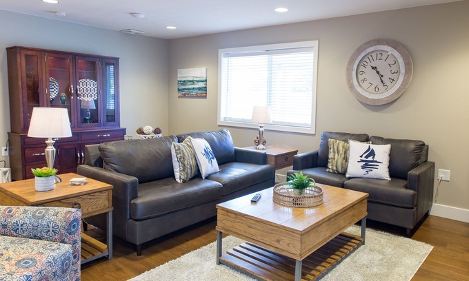 The front door opens into a comfortable living room and dining room, great for family time and family meals. Just off the living and dining area is the quaint and well-equipped kitchen, a great and convenient option for dining while on vacation. We have a coffee maker and tea kettle, toaster, air fryer, stove top, and all the dishes and silverware you need. Note, we don’t have a formal oven (just the air fryer, which has an oven setting and works for just about everything, except a rack of ribs LOL!).