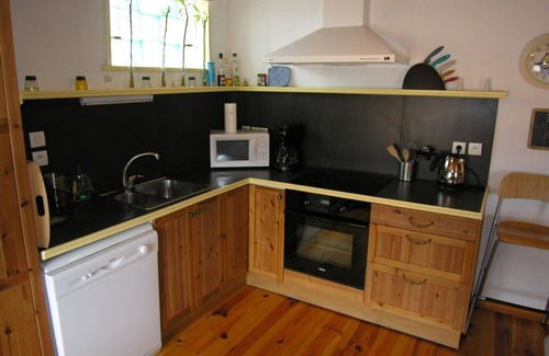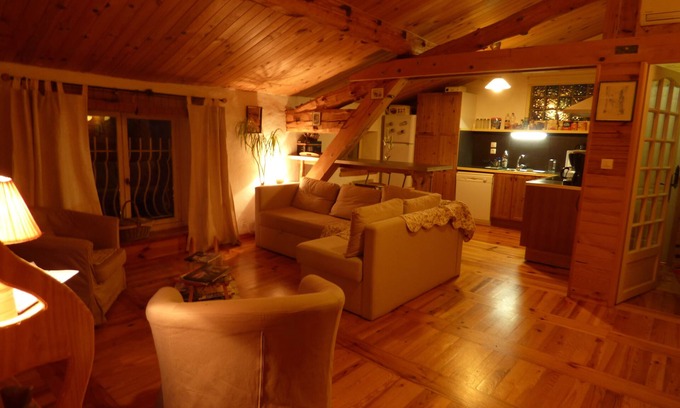Spacious 70m2 apartment, 3 rooms, 2 single bedrooms and a large living room-dining room and kitchen, cozy chalet style interior Renovation of the former dormitory of the presbytery keeping the original beams ... modern comfort, laundry, dryer, dishwasher, induction, reversible air conditioning, flat screen TV against ... by no WIFI (available in cafes instead) but a holiday atmosphere, raclette with family or friends, a base for many escapades in nature ... halfway between the mountains and the sea ... so close to the medieval city Carcassonne World Heritage.