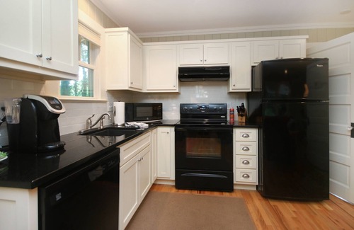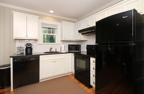 This cottage has one bedroom and bathroom with full size tub/shower separate from the main living area of combination living room and kitchen. A full kitchen -- fully equipped with complete sets of dishes, glasses, utensils, and appliances including dishwasher, full range/oven, full size refrigerator, and microwave. You will find most everything you need for cooking; pots/pans, cooking utensils, serving dishes, storage containers, baking sheets...this kitchen is very well supplied for cooking meals. Gas "wood stove" fireplace that is perfect for that cool fall or winter evening, hardwood flooring with rugs, lovely covered porch off the bedroom overlooking "secret garden" backyard oasis with chairs and table and bamboo blinds for even more privacy if desired.