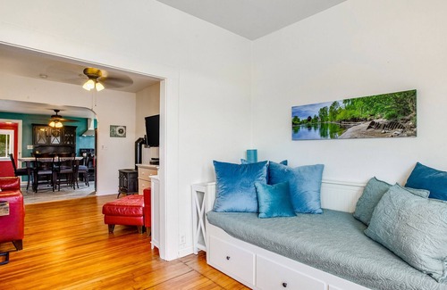 Once the sun goes down, enjoy roasting up some s'mores at the firepit, gather in the covered hangout space, whip up something delicious in the kitchen, relax with a good book in the newly remodeled spa-like bathroom featuring a soaking tub and heated floors, or head to town for great food and live music.