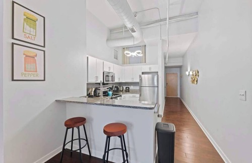 Experience comfort and style in this modern 2-bedroom, 2-bathroom downtown retreat. With large windows that fill the open living space with natural light and contemporary furnishings, it's the perfect spot to relax or catch up on work with high-speed Wi-Fi. The fully equipped kitchen features stainless steel appliances, making meal prep a breeze, while the living area offers a Smart TV for entertainment after a day of exploring.