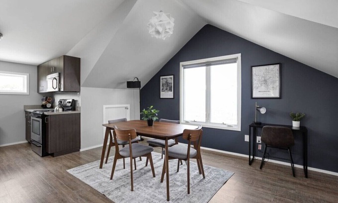 Experience comfort and relaxation in this charming carriage-style home, ideally located near Indy's vibrant Bottleworks District and Mass Ave. The inviting living area, fully equipped kitchen, and serene bedroom with a plush queen bed create a peaceful retreat. Perfect for urban adventurers, this home blends modern comforts with a peaceful vibe for a truly enjoyable stay.