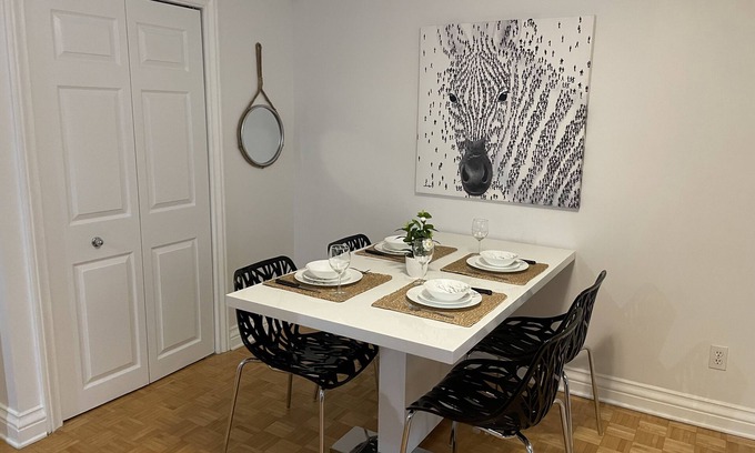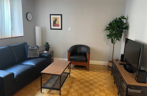 Enjoy easy access to everything Montréal has to offer from this luminous perfectly located home base (within walking distance : 4 subway stations, shopping, pharmacy/groceries, old Montreal, downtown core). Work during the day at a dedicated space with unlimited internet and play at night throughout the summer, see the fireworks, hop on a boat or have a drink on a rooftop terrace! A fully furnished cozy 2 bedroom condo apartment, awaiting just for you to drop in. Cook a nice meal with all the amenities provided or eat out casually or make it fancy, so many choices!