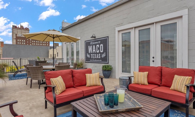 Our expansive private balcony offers views of downtown Waco and the upcoming Magnolia Hotel. Featuring spacious outdoor living and outdoor dining areas as well as a firepit, it's the perfect place to enjoy a morning cup of coffee or relax after a day of exploring. In addition to our private balcony, the property also features a shared 3rd floor balcony with an outdoor television and 360 degree views of Downtown Waco.