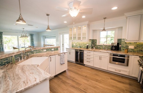 Dragonfly is a private retreat located right across the street from the sugary white sands of famous Bean Point Beach in Anna Maria, Florida. Glimpse sparkling turquoise waters from upper floor bedrooms, frolic in the pool with spa and sundeck, and outdoor kitchen, or create culinary delights in the gourmet kitchen with dual-zone wine cooler and Thermador gas range. Wide open decks with retractable privacy and sun screens plus generously sized rooms enhance guest comfort and offer plenty of space for relaxing moments or celebratory events.