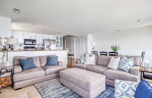 Perched on a basalt outcropping just north of downtown Depoe Bay, Whale Watchers Getaway looks down at surging ocean waves studded with seabirds, and if you’re lucky, whale spouts! Located above a kelp forest where migrating and resident whales like to feed, this elegant 2nd-floor condo will keep your eyes on the ocean as cormorants, pelicans, and gulls sweep past. Relax in front of large windows in the soothing living room, newly furnished with Oregon-made Stanton sofas, a Roku TV, and a warm electric fireplace. The dining table has an ocean view, and it’s easy to eat in from the fully equipped kitchen with quartz counters, a breakfast bar, stainless-steel appliances, and a window that looks north up the coastline to Boiler Bay. A king suite includes a recliner and TV, plus a spa-like bath with a walk-in shower. The second bedroom is furnished with two twin beds, a TV, and a window to the sea. This thoughtfully outfitted home includes some wonderful extras: a portable hammock for two; two patio chairs, a portable outdoor table, and outdoor pillows and blankets for the balcony; loads of extra blankets, floor fans, games, puzzles, and even an office desk and chair. An easy extension hose lets you spray salt from the balcony windows for the perfect view. Spend the day watching passing whales and the evenings with breathtaking sunsets.
