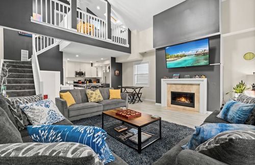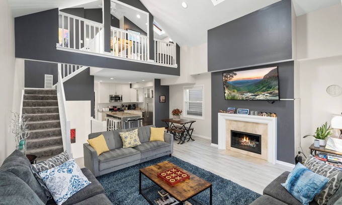 Our Loft is equipped with BLAZING FAST internet speeds of 425-550 mbps! The living room is replete with Board games galore including Cards Against Humanity, Jenga, and Texas Hold 'Em Poker and a glass-enclosed modern gas fireplace. There is a foosball table in the open den area. The Loft has a small library of books spread throughout the rooms. The Living Room is equipped with a wall-mounted beautiful Roku-enabled 65" 4K UHD with premium cable and the latest streaming services (with our commercial-free Hulu premium subscription for your viewing pleasure). There is also a DVD player for you to play your favorite home movies and classics.