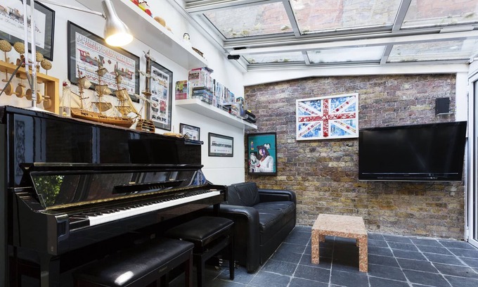 On the ground floor you will find a shower room and the first bedroom, which features sleek, purple interiors and a double sofa bed with space for two. Adjoining the bedroom is a chic conservatory sitting area with access to the patio. It has a cool design with exposed brick walls, a sleek piano (which is decorative and not for use). Sweeping doors open on to the back patio where guests can sit out during the summer for al fresco meals or evening drinks. There is an another room on this level with a double sofa bed which can accommodate two guests but may be better suited to one.