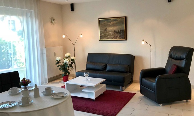 The modern and comfortable apartment Traumwohnung has been completely renovated and brought up to date. The apartment has: • 1 spacious large living room with flat screen TV, stereo, DVD player • integrated fully equipped kitchen with dishwasher, microwave, coffee maker, kettle, toaster and dining table • 1 spacious bedroom with double bed and walk-in closet • 1 modern bathroom with toilet , Bidet, vanity and very large glass shower • 1 sunny terrace including garden furniture • The price includes towels and bed linen • Parking at the house • Wi-Fi is available free of charge • In summer there is a free beach chair available