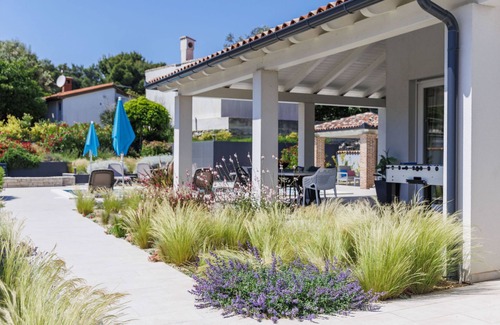 Premantura 11 km from Pula: Beautiful villa "Dream house", 2 storeys, built in 2019. 250 m from the centre of Premantura, in a sunny position, 500 m from the sea, 500 m from the beach. Private: property 950 m2 (fenced), small garden with wildlife garden, swimming pool heated (36 m2, depth 140 cm, seasonal availability: 25.Apr. - 03.Oct.) with internal staircase. Unconventional pool shape. Outdoor shower, garden furniture, barbecue. In the house: internet access, fitness room, billiard table, table football, central heating system, air conditioning, washing machine. Cook on request (extra). Parking (for 6 cars) at the house on the premises. Shop 250 m, supermarket 4.5 km, restaurant 150 m, bus stop 400 m, pebble beach 2.5 km, rocky beach 500 m. Surf school 2.5 km, tennis 750 m, riding stable 10 km, walking paths from the house 20 m, cycle lane 25 m. Nearby attractions: Nature park Kamenjak 650 m. On request: airport transfer to the holiday accommodation. Swimming pool heated (extra). It is necessary to announce 7 days in advance if the pool heating is required. Fitness room with shower/WC and exit to the garden (included). Possibility of excursions and transfer to the airport (all on request, extra). By groups of young people double deposit is requested on arrival.