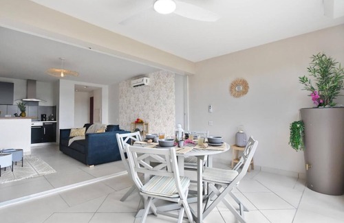 Fully renovated ground floor apartment with large terrace overlooking the lagoon. It features a flexible bedroom (2 single beds or 1 king size bed), a living room with a sofa bed (160*200), a fully equipped kitchen open to the living room, a bathroom with shower and toilet. Fully air conditioned, water cistern, wifi, swimming pool in the residence, and parking. Located in the Bellevue neighborhood, shops within walking distance and beaches just a few minutes away by car (French or Dutch side).