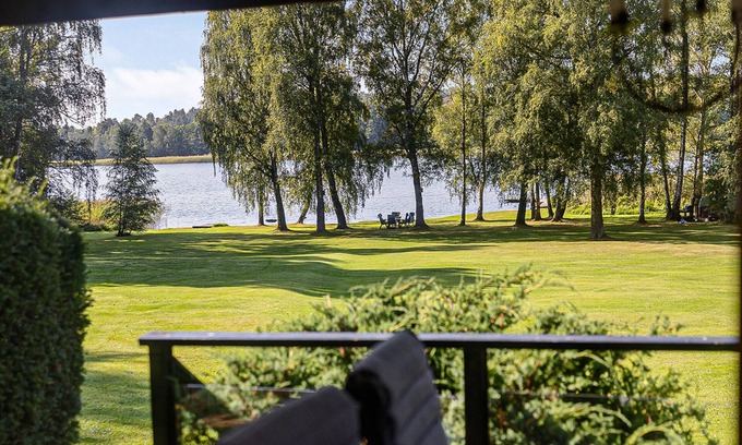 The house exudes coziness, but what really stands out is the fantastic location. The large plot offers plenty of grassy space for various activities, and you have access to a private beach where you can swim or enjoy the tranquility from the dock.