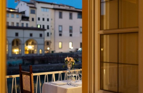 A large and elegant antique table gives the chance to a small but well stocked kitchen. A large balcony, furnished with table and chairs, is ideal for an aperitif or a dinner, watching the real heart of Florence.