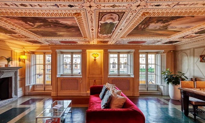 On the ground mezzanine floor, it has a beautiful four-poster bed in purplish red velvet, a beautiful fireplace and a large sofa.