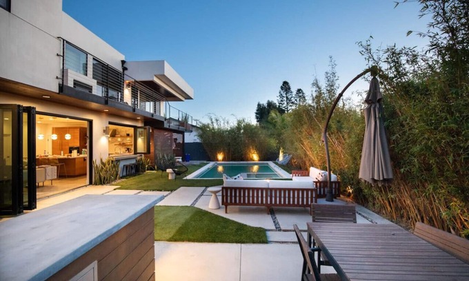 The first floor living room features a 55" Samsung Frame TV with amazon firestick that doubles as art work when not in use. With recessed lighting and concrete (micro top) floors on the entry level, and hardwood floors on the second floor, upgraded bathrooms, classic design furniture pieces like the Eames chair and Jacobsen egg chair and collectors pieces, in addition to one of the best backyards for entertaining in the entire area, this home is complete from inside out. While the inside of the home is wonderfully appointed, the backyard is this property's featured attraction according to past guests. As mentioned above, couches and midcentury modern chair seating, dedicated outdoor dining table with umbrella, natural gas fireplace, and a natural gas bbq island make the backyard a truly exception extension of this home. In addition the home offers synthetic turf in the backyard and a handful of kid friendly play accessories for climbing and play.