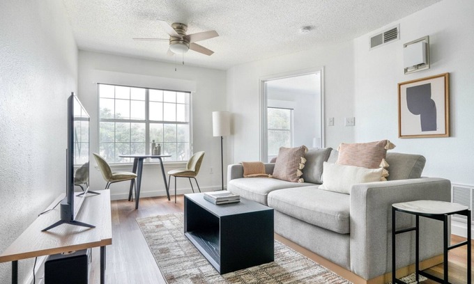 This furnished apartment is located in Arboretum, a fast-growing neighborhood north of downtown Austin. Centered around the massive outdoor shopping center of the same name, this area is known for fantastic shopping. The open-air Arboretum mall is an ideal place to shop for just about everything, since it is home to a Target, Trader Joe's, Costco, and more. There are also high-end fashion brands represented and a food court and cinema. The neighborhood is home to several hotels, and the family friendly Museum of Ice Cream is nearby.