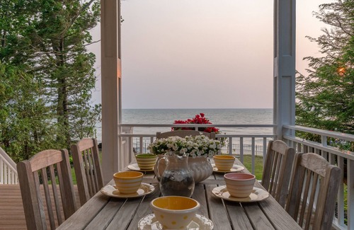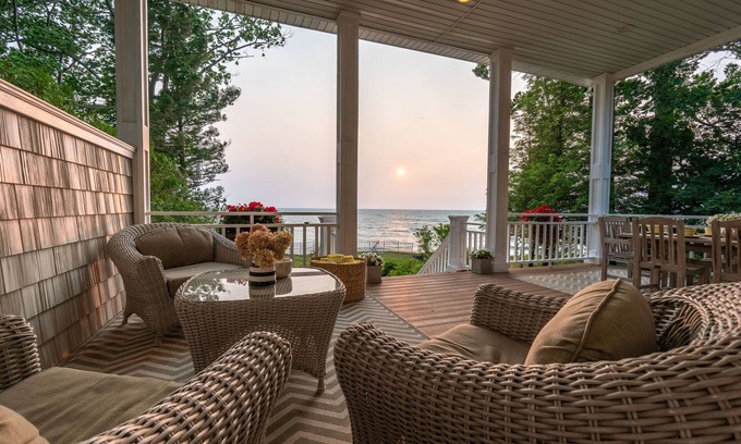 From the moment you ascend the grand staircase to enter Weque South’s inviting front porch, you’ll know you’re in for high-end Pure Michigan lakeside luxury! Enter the front door to the bright main level, which features gorgeous hardwood floors, an airy chef’s kitchen fully stocked with all the basics you need to entertain at home, and flowing open concept spaces perfect for entertaining. Every room is connected to the natural beauty of this lakefront property with large windows and doors that let the outside in. Tastefully and comfortably furnished in subtle tones, the space has been tailor-made for appreciating the stunning Lake Michigan sunset in cozy, laid-back style. Head back out to the wide front porch featuring outdoor seating and dining, or take a walk on the lush grounds. We can’t forget to mention that Weque South has private beach access right from the backyard! Pack a beach bag, grab a towel, and start your descent down the stairs to the sandy shores below. You’ll be enjoying sunsets right on the beach, or take to the top of the bluff and catch it from there!
