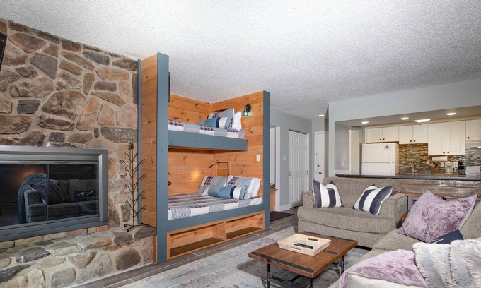This is a charming, fully-renovated third floor condo with stone fireplace. Living area has a panoramic view of Great North Mountain and Bryce Resort Golf Course when the five-foot-wide custom barn door is open. The Dining area is bar seating at the kitchen bar/counter. The huge bedroom as a new queen bed, and additional sleeping capacity is provided by custom bunk beds in living room area (huge hit with kiddos!) This unit comfortably sleeps up to five. You'll love the short walk to the ski lift and Bryce Resort's facilities. The living room features a substantial stone fireplace, new furnishings, and a smart TV (streaming only via Amazon Firestick). The bedroom also includes a smart TV. The bathroom features separate powder and shower/commode rooms, plus washer/dryer combo unit.
