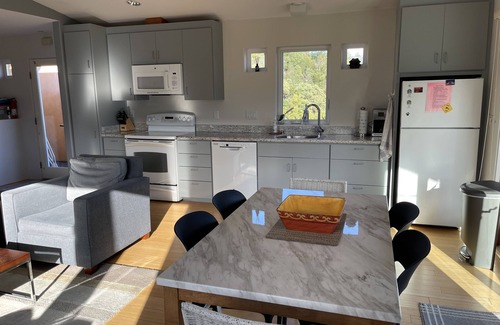 The vaulted, airy main room with its bamboo flooring has a rectangular dining table that seats up to six. There's also a pull-out queen sofabed that converts into an additional sleeping platform. For entertainment, there's an AV receiver, SONOS, iPod connection, Apple TV, a 42" flat screen TV with a DVD/VCR player and Dish satellite with ~120+ channels for your viewing enjoyment. Through Apple TV, you may connect your own streaming accounts (Netflix, Prime Video, etc.). Board games, puzzles and reading materials round out the relaxation options. If business calls, there is a built-in desk for use with your laptop to connect to the available Wi-Fi network throughout the villa.