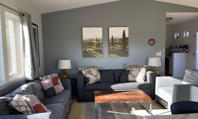 Perched on a 40-acre hilltop right among the grapes at Lavender Hill Vineyards and about a mile up a paved private road and behind automatic gates, this secluded home comfortably sleeps 4 - up to 6 people max - and is the perfect retreat in wine country. It's just 12 minutes to the downtown Healdsburg plaza and is very close to many award-winning wineries. Lake Sonoma is 10 minutes up the valley. The iconic Dry Creek General Store is a short drive away.