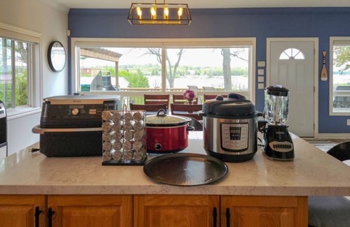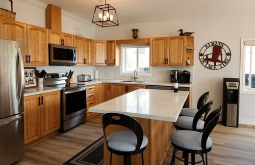 Ducking Away is a wonderful Ontario cottage rental 4-bedroom cottage with sunset views over the waters of Georgian Bay. The kitchen, living and dining areas are open concept and overlook the deck, yard and waterfront - so during your waking hours you will always be aware that you are no longer in the city. There are 4 bedrooms - 2 on each side of the road-facing end of the cottage, along with the main bath and an en suite off the master bedroom. There is good WiFi here, so you can brag to your friends and family what a great time you are having...and, OK, a video conference or two for work if you feel you absolutely must. Satellite TV is here so you can catch the game, the movie or keep up with your soap.