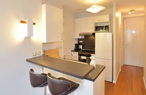 This 4th-floor serviced apartments lyon, located in a lovely building with elevator, features a main room with a fitted open kitchen, a living area, an office area and a sleeping area that opens onto the room.
