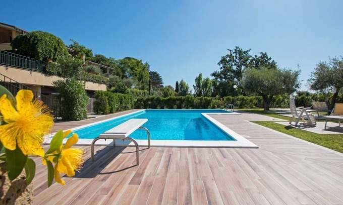 The apartment, completely renovated and newly refurbished, is located on the first floor with a large terrace and rear garden.It's composed of a large living room with two sofas, TV, dining table, independent and fully equipped kitchen with fridge, freezer, gas hob, oven, microwave, kettle, american coffee machine and refrigerator. From the living room windows you can access the splendid terrace overlooking the lake, equipped with sofas and a large table with chairs. The apartment continues with the bedroom equipped with double bed, wardrobes, air conditioning and overlooking the terrace.The second bedroom consists of 2 bunk beds of size 85 x190. The apartment is completed with a bathroom with shower, sink, toilet and bidet.Guests can enjoy a pool that is shared with 5 other apartments, open from the 15th of May to the 30th of September.Guests will benefit from a garage (measurements: width 2.40m length 5.40m height 2.60m) and an outdoor parking slot inside the property.*Self check-in is available to access the accommodation. Instructions on how to use this service will be sent a few days before your stay.*Cot and high chair available upon request, at an extra cost of 35€ per stay, per item.*Upon arrival or a few days before arrival it may be required to pay a tourist tax, which varies according to local regulations. You will find your reservation details within the Guest Area of Wonderful Italy.We also offer to our guests truly authentic experiences to live like a local. If interested, contact us and we will be more than happy to help you out designing an unforgettable holiday to discover Italian beauties.Soiano del Lago, an enchanting town near Lake Garda on the Brescia side, takes its name from "Solis ianua" (literally “Gateway of the Sun”) which is enough to define the characteristics of this small village in Valtenesi, rich in vineyards and olive trees surrounded the green of the hills. In Soiano del Lago, the Castle dating back to the 10th century is definitely worth a visit, as it is also the site of events during the summer. To visit nearby, there is Moniga del Garda with its splendid beaches and Castle of Padenghe.For guests who prefer a relaxing trip, it is possible to reach Salò and take a boat to visit the lake while sailing.The hinterland of Soiano del Lago offers quiet places surrounded by the typical olive trees of the Valtenesi area, on Lake Garda, where tourists can take part to tastings and stop at local restaurants to taste the typical "spiedo bresciano" (meat and potatoes slowly cooked on a revolving spit).The apartment is about 45 km from Verona airport and about 9 km from Desenzano railway station.