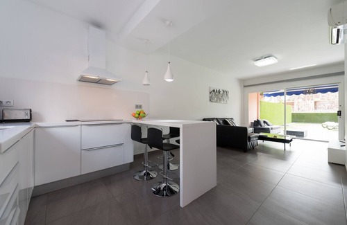 This modern, fully refurbished duplex apartment offers a perfect retreat for those seeking comfort and convenience by the beach. With two bedrooms, it comfortably accommodates up to 4 guests. The property features two bathrooms, a private pool, and access to a communal pool. Each room is equipped with air conditioning, smart TVs, and high-speed Wi-Fi, ensuring a relaxing and enjoyable stay. The main floor includes an open-plan living room with a fully equipped kitchen, and spacious terraces with sun loungers, a chill-out area, and an outdoor dining space with a barbecue. The apartment is situated in the prestigious Maspalomas/Meloneras area, making it ideal for families or groups. The location offers easy access to some of the best attractions in Gran Canaria. The Meloneras Beach is only 150 meters away, and the Maspalomas Beach is within walking distance. Guests can stroll along the beautiful promenade towards the Maspalomas Lighthouse, lined with high-class restaurants. Nearby, you’ll find a shopping center, supermarket, and various cafes and restaurants just 300 meters away. For golf enthusiasts, discounts are available at nearby courses like Salobre Golf Resort and Anfi Tauro Golf. The property is also conveniently located within a short drive from the airport and major shopping areas. The apartment comes with a well-equipped kitchen featuring a refrigerator, microwave, oven, freezer, dishwasher, and coffee maker, allowing guests to prepare their meals with ease. Additional amenities include a washing machine, iron, and a garden with furniture for outdoor relaxation.