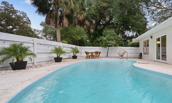 Nestled in a quiet neighborhood 5 minutes from vibrant downtown New Port Richey. Two attached homes in one, sleeps 12 and is the perfect getaway for families and friends travelling together. With a total of 5 bedrooms plus 2 futons, each house has its own living room, kitchen, dining area & bathroom. Enjoy the private backyard heated pool, indoor & outdoor games, or travel a short 10 minutes to nearby Robert K Rees Beach, James E Grey Preserve & Werner-Boyce Salt Springs State Park.