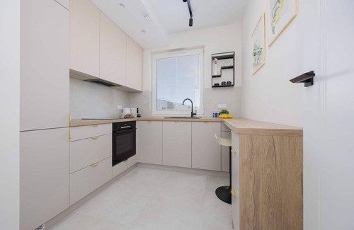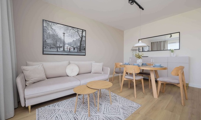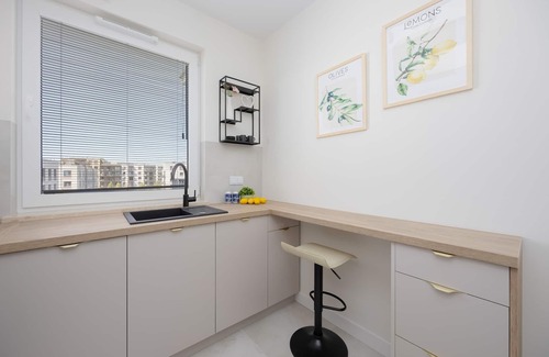 A modern apartment designed for four people invites you to a space where functionality meets aesthetics. Bright interiors in natural colors, subtle accessories and a well-thought-out layout of the rooms mean that you can start each day in a peaceful atmosphere. The heart of the apartment is a cozy living room with a large TV and access to Smart TV and air conditioning, which is conducive to shared rest and relaxation. The sofa bed located here allows you to comfortably relax, and large windows open onto a balcony overlooking the green surroundings, ideal for morning coffee or evening conversation in the fresh air. The kitchen was designed for those who value self-catering. Equipped with an oven, dishwasher, microwave, induction hob, fridge with freezer, electric kettle and capsule coffee maker, it allows you to easily prepare everyday dishes. Next to the kitchenette there is a dining table, where you can sit down together for breakfast or dinner. The bedroom has a comfortable double bed, and the bathroom has a modern shower cabin, a washing machine hidden in the wardrobe, a hairdryer and a large mirror that optically enlarges the space. Every detail has been taken care of in the apartment - a desk for work, a clothes dryer, an iron with an ironing board and a vacuum cleaner have been prepared. The property is also equipped with a smoke and carbon monoxide detector. Guests have access to fast Wi-Fi internet, which makes it easier to both relax and work remotely. The building has an elevator and an underground car park with a parking space and a 2-meter high gate. The location among greenery and the aesthetic surroundings of the building are conducive to walks and active outdoor recreation. This is a space where you can feel at ease and relax from the everyday hustle and bustle, enjoying peace and comfort.