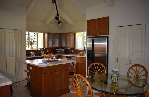 Take a refreshing dip in the private swimming pool, beautifully framed with colorful tropical plantings, then lounge on the Mediterranean-style lanai while catching up on your reading in one of the comfortable poolside chaise-lounges. A gas grill stands ready to prepare your fish and farmer's market purchases. Dining is casual indoors or outdoors on the lanai teak dining set. Afterwards, come inside take a long relaxing soak in the master bathroom deep tub, then watch a movie on the plasma TV in the living room (an eclectic set of movies available for your enjoyment), complete with surround sound, or on a TV in either of the bedrooms. Catch up with your email, financial markets, or plan your next day’s adventures using the high speed wireless internet connection available in the den.