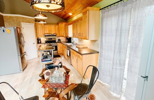 The kitchen on the Main Level is equipped with a commercial grade prep table for cooking, refrigerator, microwave, stove/oven, and a dishwasher. It includes flatware, cooking utensils, pots and pans, glassware, and staple pantry items/spices/condiments. A coffee pot and Keurig are available as well as your basic small kitchen appliances. A bar table and stools looks out to the backyard, and a slider patio door to the furnished back deck makes it easy access to enjoy outdoor dining.