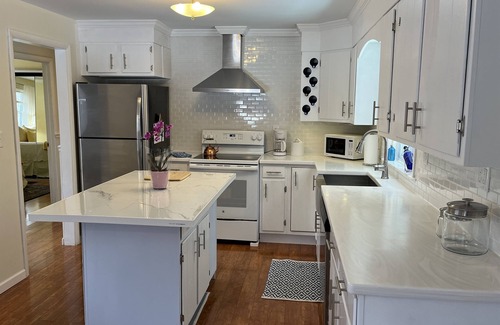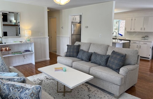 Inside, the home has been remodeled with trendy contemporary decor and is sure to please even the most discerning traveler. White kitchen cabinets and coutertops, paired with stainless steel appliances make this space bright and inviting. You might even find yourself wanting to cook on vacation. There is easy access from the kitchen to either the front or rear decks for grilling and outside dining. A comfortable living room with 2 couches and a large SmartTV makes for a great spot to relax after a long day of baseball.