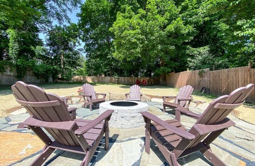 The backyard has an outdoor dining table and landscaped fire pit. Just down the block are riverfront eateries and views!