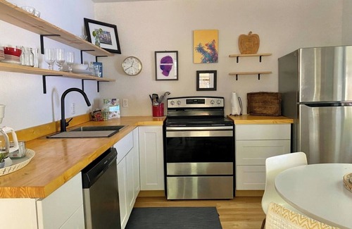 Our full kitchen is complete with modern appliances and all the essentials you need to whip up your favorite meals. The open concept design allows for easy interaction with guests in the living area.