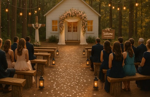 Just outside of the DFW area is a venue nestled in the Piney Woods of Mineola, Texas is a place called Rustic Trails Texas LLC. Take a trip into the piney woods and spend the weekend in this vintage replica of a western town and stay in this cabin also known as our Church. It is set up as a real small western church and makes a great venue setting.