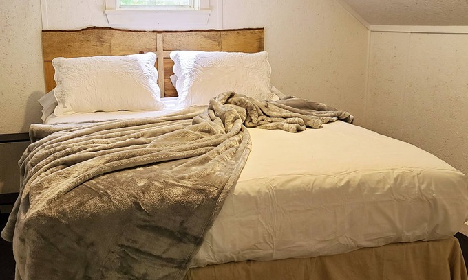 This adorable cabin offers a cozy retreat for guests as well as great venue setting. Many of the features have been created from the pine wood that was removed on the property and you will see it all throughout the cabin, including the beds. This cabin includes an all purpose room featuring a 58 inch Roku TV and a 40 inch Roku TV in the bedroom. It even has pull out couch for extra sleeping in the all purpose room. Upstairs is a full queen size bed with a sitting area that has two fold out twin size beds. There's plenty of space to unwind. The cabin also boasts a well-equipped bathroom with a claw foot bath tub, shower, heating, TV, cooking equipment, WiFi, and AC for a comfortable stay. This is a brand new development, so join us and be one of the first to explore!
