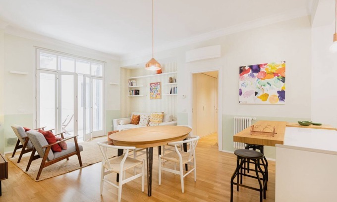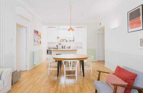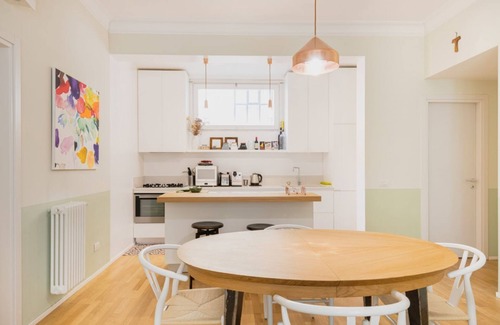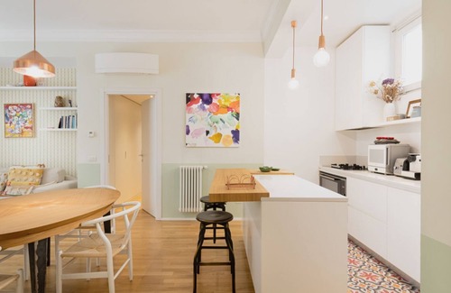 Enjoy a delightful stay in this elegant retreat with a balcony, located on the first floor with an elevator, in the heart of one of the most characteristic neighborhoods of the city. The home welcomes you with a charming open living area, which includes a modern kitchen, a dining table, a comfortable sofa, and a smart TV. The balcony, like a window to the world, adds light and provides a space for moments of relaxation.