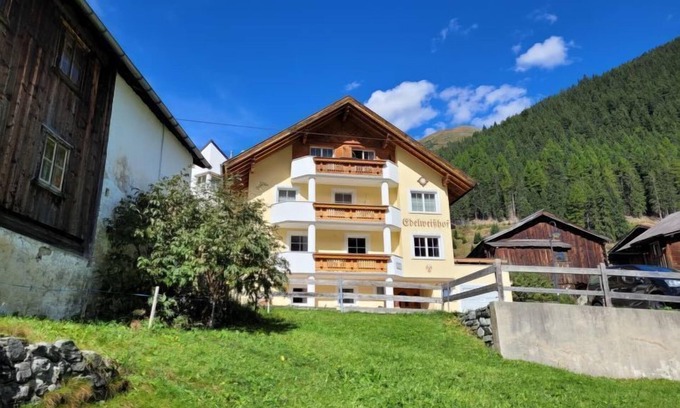 Mathon 5 km from Ischgl: Large, cosy apartment block "Edelweißhof", surrounded by meadows and fields. On the outskirts, traffic calmed area, 200 m from the skiing area. In the house: reception, breakfast room, WiFi, sauna (extra). Storage room for skis, central heating system. Bread roll service and breakfast on request (extra). Parking (limited number of spaces). Grocery 200 m, restaurant 300 m, bakery 200 m, bus stop 400 m, outdoor swimming pool 2 km, indoor swimming pool 5 km, bathing lake 20 km. Tennis 5 km, riding stable 4 km, sports centre 5 km, walking paths from the house, cycle lane 20 m, mountain railway 5 km, ski lift 200 m, skisport facilities 5 km, ski rental, ski bus stop, cross country ski track 400 m. Nearby attractions: Paznauner Bauernmuseum 200 m, Bielerhöhe 16 km. Well-known ski regions can easily be reached: Ischgl 5 km, Bergbahnen Silvretta - Galtür 9 km. Hiking paths: Friedrichshafener Hütte, Zeinissee 12 km. Please note: car recommended. Ski bus (free of charge). Free ski bus service to the ski region Ischgl.
