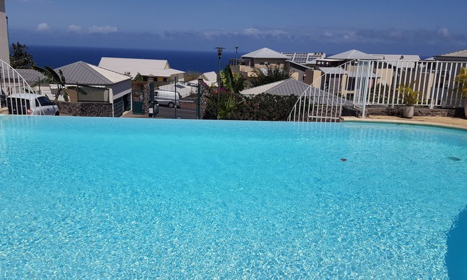Large luxury T2, 49m2 air-conditioned for 4 people, in quiet and secure residence with private parking and numbered, infinity pool, kitchen, washing machine, new room (160 X200 quality bedding), new sofa bed (140x190 quality bedding ), wifi, calls to fixed and mobile in Reunion and metropolis included, large terrace of 21m2 with superb sea view. Cot and baby chair available free of charge on request. Sheets and towels provided.