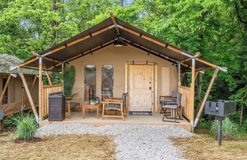 Each of these gorgeous "safari tents" has everything you need for a getaway in Williamstown KY! Inside each tent you will find two bedroom zones, with a queen bed and a twin/full bunk! You'll also have a mini fridge and coffee maker, with complimentary coffee, creamer, sugar, and tea. A small dining table and overhead AC/Heating unit complete the cozy space for the comfortable accommodation of up to 5 guests per tent! Bathrooms are located in a bathhouse with 4 private, full bathrooms, at the top of the hill, which is designated for the exclusive use of our safari tent guests! Outside, you will also find some outdoor seating on the deck, a charcoal grill, and a fire ring. Enjoy plenty of outdoor space to explore, including walking trails, scenic ponds, and an exciting playground alongside two communal picnic pavilions/and gas grills! Note that wheelchairs and walkers may have trouble with the gravel drive and slopes to and from the tents. Tent G features a raised grill and easily-accessed fire and picnic area for those with mobility issues. Also note that there is an emergency medical helicopter pad nearby. The helicopters take off and land occasionally, creating noise but are also fun for kids to watch as they come and go!