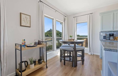 Eden Vista is a magical lakeside retreat with sweeping views, from a cozy & stylish home with a large deck and private heated pool. Bedrooms have en suite full bathrooms, blackout curtains, phone chargers and sound machines. Half bath in hall. Fully fenced yard with gate. Prime location with proximity to Whitewater Amphitheater, alpine slide at Camp Fimfo, the Guadalupe River, charming downtown Gruene, hiking and wineries. Whether you enjoy the outdoors, shopping, dining, or simply relaxing with a view, your Canyon Lake getaway awaits!