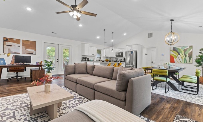 Upon entering through the front door, you'll arrive in the open-concept living area, which includes a comfortable living room, workspace, dining area and spacious kitchen - perfect for spending time with your whole group, whatever the activity. Enjoy a spacious sofa, ottoman, and a smart TV. The dining space has a table for 8 and the kitchen is fully equipped and designed with modern conveniences. Vacation is no time to do laundry, however, you can - if you want! This home is equipped with a laundry room with a full-sized washer and dryer for your convenience.