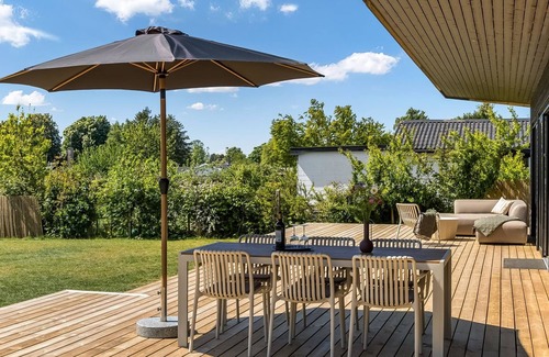 Single-family house, built in 2024. Private: property 1'362 m2, well-kept garden. Outdoor shower, terrace (100 m2), barbecue. In the house: sauna, washing machine, tumble dryer. Parking at the house. Grocery 2.2 km. Golf course 19.5 km. The owner does not accept any youth groups.