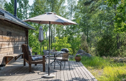 "Ekbacken", 2-room house 66 m2. Object suitable for 3 adults + 2 children. Spacious, with sloping ceilings, tasteful and cosy furnishings: open living/sleeping room with 1 double bed (180 cm, length 200 cm), TV. Sleeping alcove with 1 bed (80 cm, length 200 cm). Large, open kitchen (4 hot plates, oven, microwave, freezer, electric coffee machine) with dining table. Exit to the garden. Shower/WC. Heating, electric heating, boiler (70 litres). Upper floor: (ladder) small sleeping alcove 12 m2 with 2 beds. Wooden floors. Comfortable furnishings in the country house style. Large terrace 24 m2. Terrace furniture, barbecue (portable). Beautiful view of the lake, the countryside and the forest. Facilities: washing machine, iron, logs (extra). Internet (WiFi, free). Please note: non-smoking house. Maximum 1 pet/ dog allowed. Smoke alarm, fire extinguisher. TV via casting. Instead of an enclosed bedroom, some sleeping areas are located in an open-plan area (gallery, alcove, etc.).