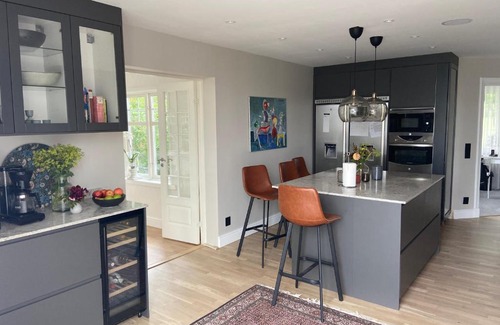 Featuring a private pool and garden views, Ekparken Rosenlund is set in Jönköping. Located 600 metres from Vatterstranden Beach, the property provides a terrace and free private parking. With free WiFi, this 5-bedroom villa offers a flat-screen TV, a washing machine and a kitchen with minibar. Sannaangen Beach is 2.1 km from the villa, while Elmia is less than 1 km away. The nearest airport is Jönköping Airport, 16 km from Ekparken Rosenlund.