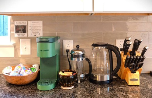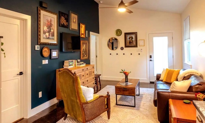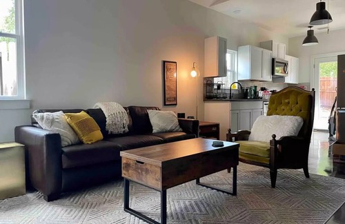 Nestled among trees on a street steeped in mid-century design, get away from it all or get work done. The comfy, clean and modern space is complemented by restored pieces, vintage touches and local wares. 2 bedrooms with ultra-comfy queen beds + dedicated baths, plus queen sleeper sofa with new memory foam mattress. Gleaming kitchen stocked with extras. Positively, delightfully Denton!